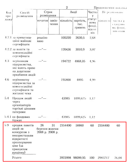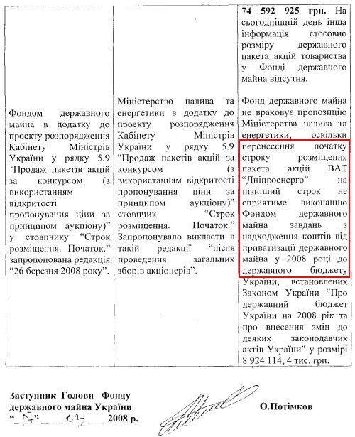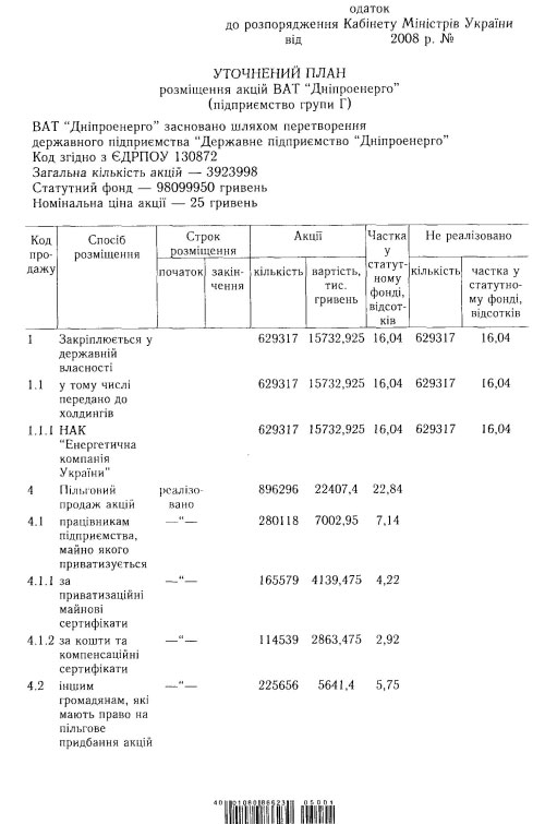 Как видно с документа, Тимошенко предусматривает продажу 60% "Днепроэнерго" на открытом аукционе, который должен состояться до 31 октября 2008 года.