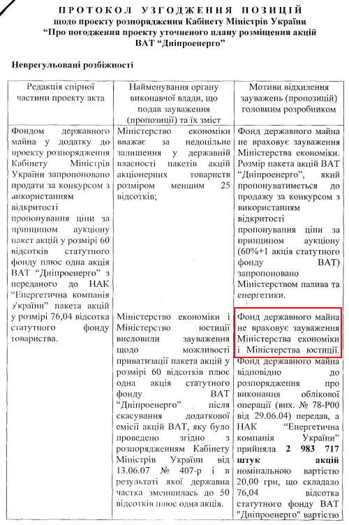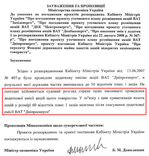 "На сегодняшний день в производстве находятся судебные дела, связанные с проведенной в 2007 году дополнительной эмиссией "Днепроэнерго". Учитывая это, регулятивное значение распоряжения может быть нивелировано", - предупреждает в своем письме министр юстиции Николай Онищук.