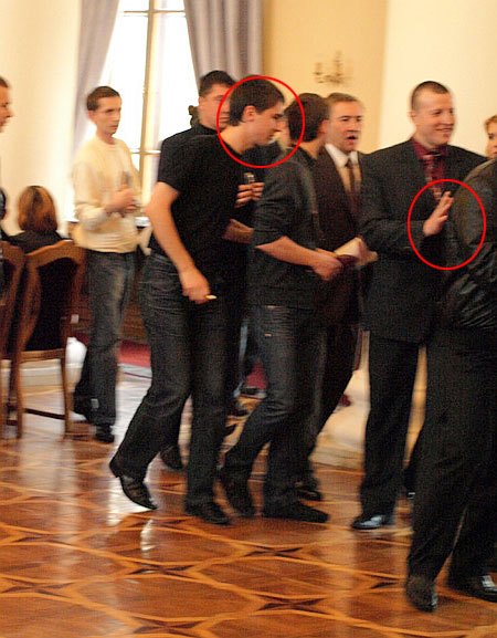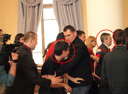 С фото, предоставленных "Украинской правде" Юрием Шеляженко, видно, как журналист газеты "Крещатик" Михаил Шкурин сначала приблизился к Черновецкому, а потом был оттеснен его охраной.