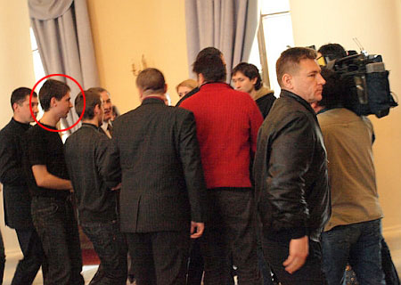 На последнем снимке видно профиль Шкурина в толпе журналистов, которые старались задать вопросы Черновецкому. Вместе с тем мэр так и не ответил ни на один из них, а охранники освободили ему проход, вытеснив представителей СМИ.