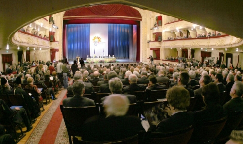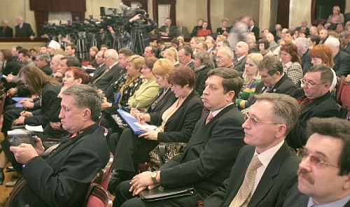 Мы посмотрели в партер и увидели до боли знакомые лысины и шиньоны - главы облгосадминистраций, руководители управлений культуры и образования, приправленные руководством творческих союзов, депутатами и другими официальными представителями культуры.