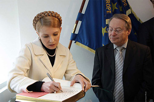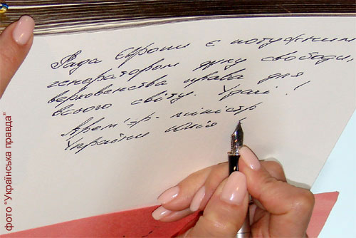 Тимошенко по прибытии в Совет Европы ждала традиционная процедура – запись в книге почетных гостей. Как известно, в прошлом году здесь произошла целая серия конфузов. Виктор Янукович свои пожелания переписал из шпаргалки, при этом сделав несколько ошибок. А Тимошенко эту историю хорошо знала, поскольку во время выборов неоднократно на митингах насмехалась над своим оппонентом и его грамматикой.