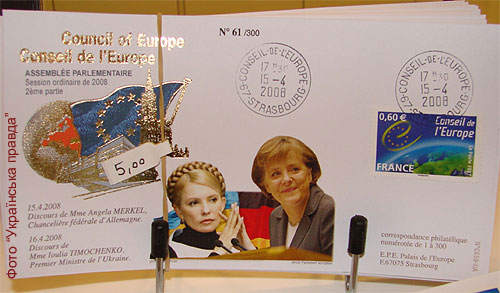 По традиции, по случаю приезда Тимошенко европейское издательство филателистов подготовило конверт, где изобразило украинского премьера рядом с немецким канцлером Ангелой Меркель, которая произносила речь за день до Тимошенко.