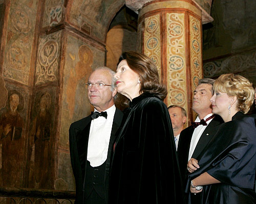 Виктор Ющенко вместе с женой Катериной и Король Швеции Карл XVI Густав с королевой Сильвией во вторник вечером посетили Национальный заповедник "София Киевская", осмотрели Софийский собор, в частности, отреставрированные Царские врата, а также колокольню, на которой летом были установлены новые колокола, сообщает пресс-служба президента.