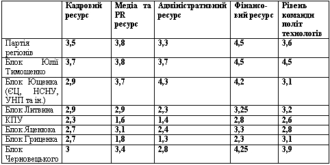 Найбільш високої оцінки від експертів удостоївся фінансовий ресурс Парті Регіонів – 4,5 бали, за 5-ти бальною школою. Фахівці високо оцінили фінансовий ресурс БЮТ - у 4,5 бали, та рівень команди політтехнологів блоку - 4,5 бали. Рівними у Партії регіонів та БЮТ є медіа та PR можливості - по 3,8 бали. БЮТ може похвалитися найбільшим рівнем кадрового ресурсу, оціненим у 3,7 бали у порівнянні з 3,5 балів у Партії регіонів.
