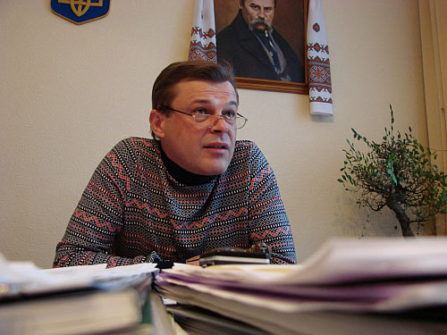 Як і в старі добрі часи, Терьохін багато палить і різко коментує. За його спиною висить портрет не президента і не прем’єра, а Тараса Шевченка.