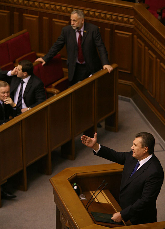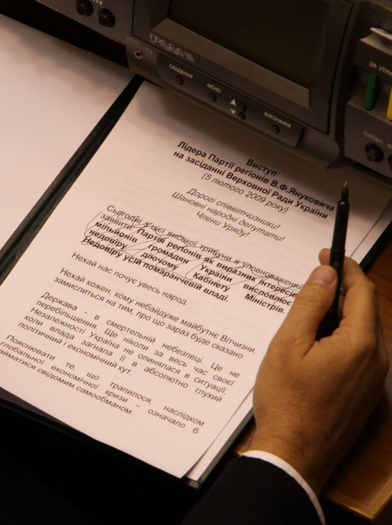 Перед цим лідер регіоналів сидів у своєму кріслі у сесійній залі, де читав і перечитував підготовлений для нього текст. "Сьогодні я уповноважений заявити з цієї високої трибуни: Партія регіонів як виразник інтересів мільйонів громадян висловлює недовіру діючому Кабінету міністрів, недовіру усій помаранчевій владі", - починалася промова, надрукована для Януковича, як не дивно, без знаків наголосу.