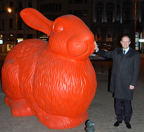 Яценюк був запрошений до участі в "Брюссельському форумі". Захід відбувався у готелі "Конрад", напроти якого шоколадна фабрика Neuhaus в рамках рекламної акції виставила чотири величезних... помаранчевих кролика.