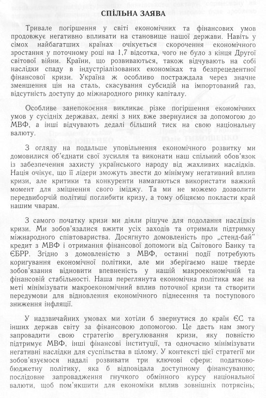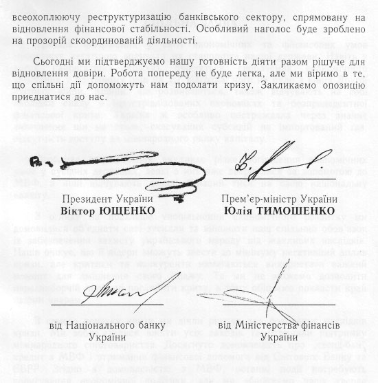 Як тиждень тому запевняв Григорій Немиря, який готував проект тексту, таке звернення є вимогою МВФ для продовження кредитної лінії стенд-бай. Окрім президента і прем’єра, заяву скріпили підписами в.о. голови Нацбанку Анатолій Шаповалов і в.о. міністра фінансів Ігор Уманський.