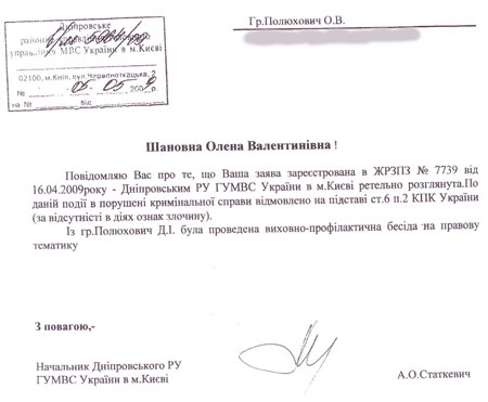 Еще более абсурдным выглядит ответ начальника того же отделения МВД – Статкевича А.О. После абзаца об отказе о возбуждении уголовного дела (с той же формулировкой – "в связи с отсутствием в действиях признаков преступления"), начальник МВД дописывает: "С гр. Полюховчи Д.И. была проведена воспитательно-профилактическая беседа на правовую тематику".