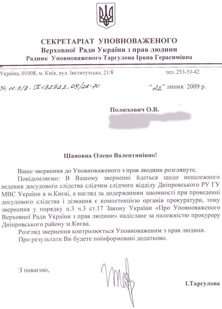 Не отреагировала на обращение Елены Полюхович и омбудсмен Нина Карпачева. В ответ на письма матери пострадавших детей, секретариат госпожи Карпачевой пообещал направить все ее жалобы прокурору Днепровского района Киева.