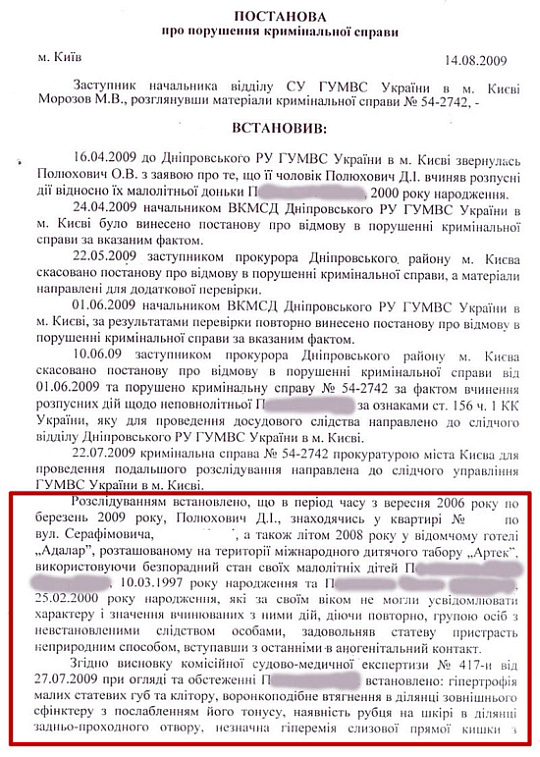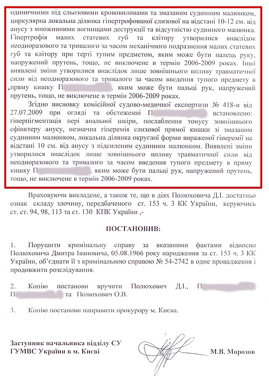 Кроме того, в распоряжении "Украинской правды" оказался еще один официальный документ – постановление о возбуждении уголовного дела в отношении Дмитрия Полюховича, где приводятся шокирующие результаты последней судебно-медицинской экспертизы, которой подверглись сын и дочь Дмитрия Полюховича в июле 2009 года.
