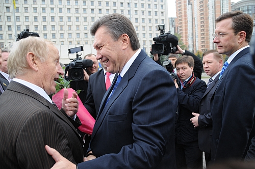 Янукович підійшов до В'ячеслава Богуслава, як виявилося той святкує в середу день народження, і вручив йому заготовлені троянди.