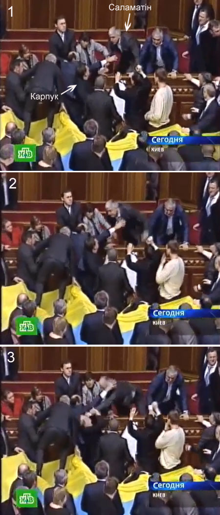 Отже, 27 квітня під час протистояння у сесійній залі Саламатін опинився у гущі подій. Він піднявся до урядової ложі та, отримавши перевагу в зрості, ударив згори депутата Володимира Карпука з "Нашої України".