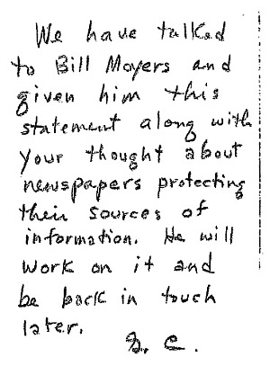 | Мы говорили с Биллом Мойерсом и дали ему это заявление вместе с вашей идеей о защите газетами своих источников информации. Он поработает над этим, (заявлением - УП) и позже с вами свяжется. |