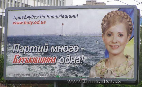 У першому випадку маємо справу із спробами розказати все і нічого, оформити це руками не найгірших дизайнерів і масово розвісити на вулицях. Як правило, така реклама, як у Партії регіонів, Фронту змін, Народної партії, Батьківщини і т.д. мало впливає на вибір конкретного мера, чи кандидата-мажоритарника. Звичайно, є кореляція між голосуванням по партійних списках і рекламними сюжетами, однак вона незначна - в першу чергу люди голосують за прізвища.