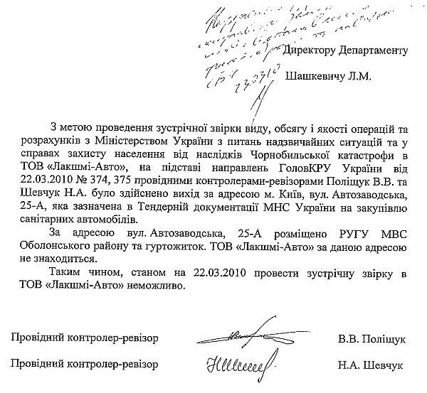 У звіті аудиторів зазначалося, що у листопаді 2009 Міністерство надзвичайних ситуацій "уклало договір з українською підставною компанією ТОВ "Лакшмі-Авто" на поставку 27 транспортних засобів марки "Рено Мастер".