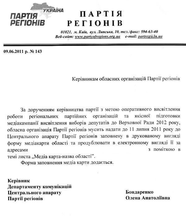 "За дорученням керівництва партії... з метою якісної підготовки медіакампанії висвітлення виборів депутатів до Верховної Ради 2012 року, обласна організація Партії регіонів мусить надати до 11 липня 2011 року до центрального апарату Партії регіонів заповнену форму медіакарти області. Форма заповнення медіа-карти додається", - ідеться в циркулярі.