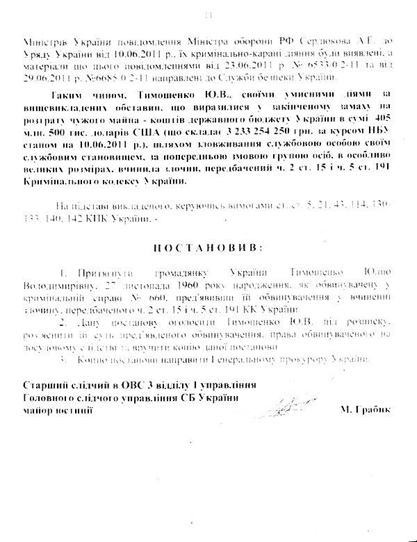 "Украинская правда" получила из своих источников полный текст постановления о привлечении Юлии Тимошенко в качестве обвиняемой по уголовному делу, возбужденном СБУ в связи с долгами корпорации ЕЭСУ перед Министерством обороны России.