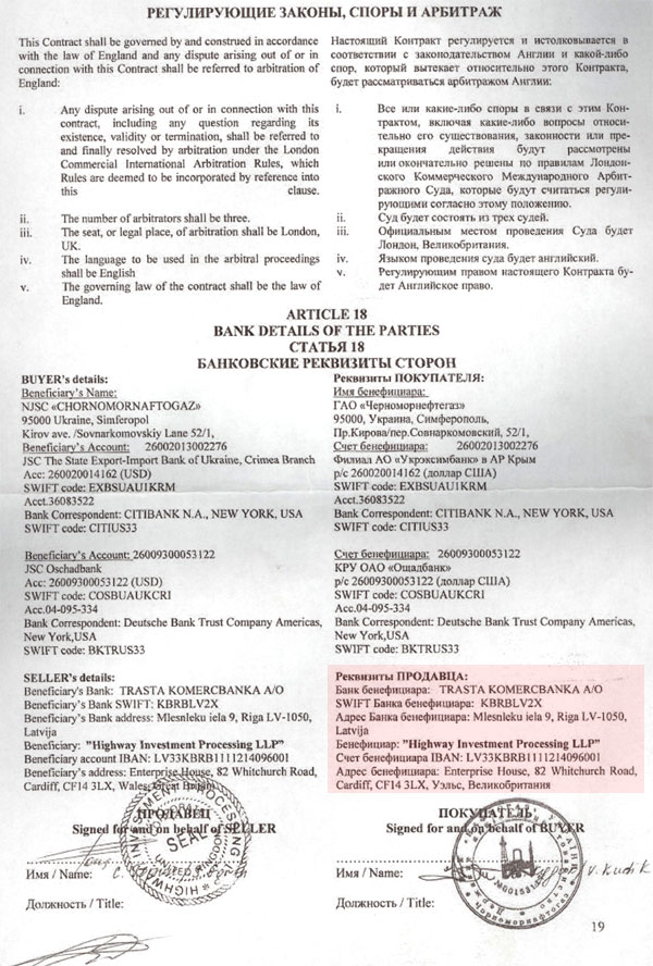 Так, в око впадають реквізити фіктивної британської контори Highway Investment Processing LLP, яка продавала вишку українській державній компанії за завищеною ціною.