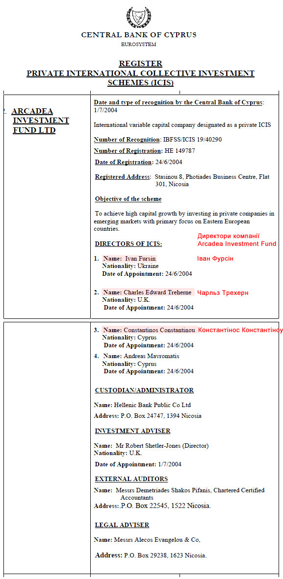 Ми пішли далі та знайшли додаткові зв’язки між цими людьми. Виявилося, що цей самий британець Чарльз Трехерн разом з українцем Іваном Фурсіним мали спільний офшор на Кіпрі - компанію Arcadea Investment Fund Ltd.