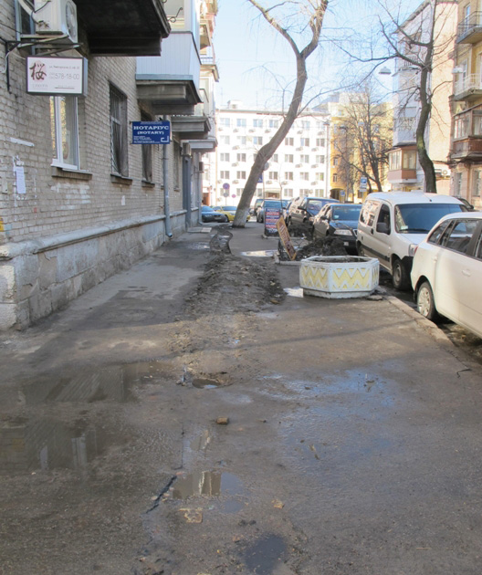 Ось так виглядає вулиця Рейтарська вже декілька місяців. Окрім щільної парковки, тротуар перетворився на будівельний майданчик: чи пов'язано зміна комунікацій вздовж вулиці із Євро-2012, чи ні, проте ходити пішоходам просто ніде. До того ж, перехожі вже тривалий час змушені мимоволі пересуватися по коліна у багнюці.