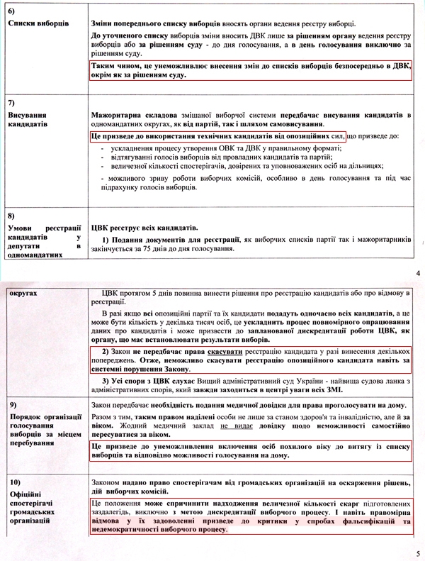 По-перше, у провладній команді вважають загрозою право спостерігачів від громадських організацій на оскарження рішень та дій виборчих комісій. Як зазначається у документі, "це може спричинити надходження величезної кількості скарг, підготовлених заздалегідь, виключно з метою дискредитації виборчого процесу. І навіть правомірна відмова у їх задоволенні призведе до критики у спробах фальсифікацій та недемократичності виборчого процесу".