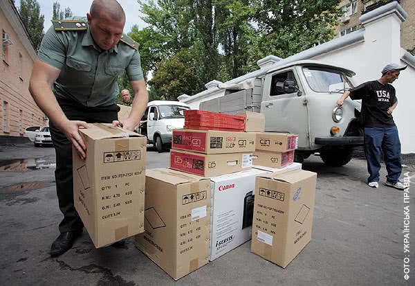 На доказ слів про благодійність на ганок винесли коробки з оргтехнікою від профспілки і поставили прямо на асфальт. У двох метрах від них стояв автозак, у якому смажилися три конвоїри.