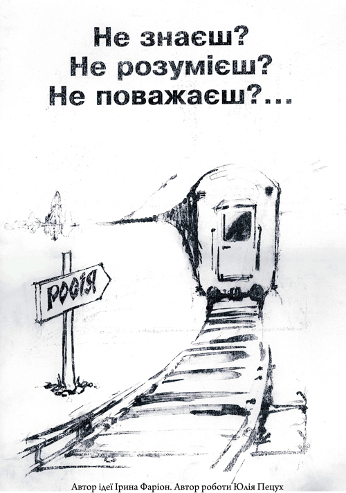 І ця виставка потім стала традиційною. І ось у 2003 році одна студентка намалювала класний плакат: поїзд, стрілочка в бік Росії і три дуже толерантних запитання: "Не знаєш?", "Не розумієш?", "Не шануєш?". Дідо мій в таких випадках казав: "Гибай звідси". Видавництво Львівської політехніки з моєї ініціативи видало вже три добірки мовних плакатів, серед яких і цей – хітовий.