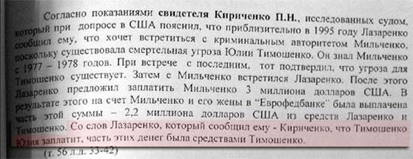 Но, во-первых, Петр Кириченко нигде не указывал, что деньги перечислялись именно за убийство; во-вторых, он нигде не утверждал, что распоряжался деньгами Orphin S.A по указанию Юлии Тимошенко. Наоборот, во всех своих показаниях он ссылается на приказы Павла Лазаренко.