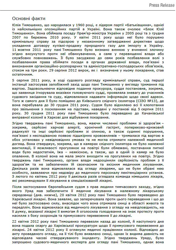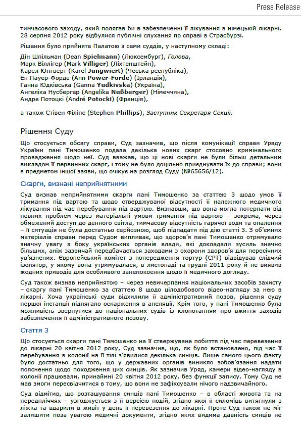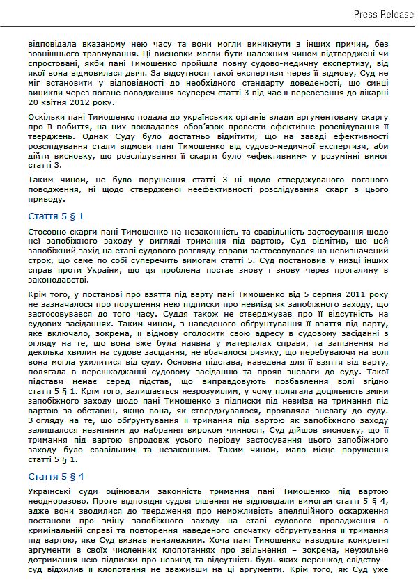 Вместе с тем, Евросуд большинством голосов установил, что нарушения прав Тимошенко по ст.3 (запрет на пытки) Европейской конвенции по правам человека не было.