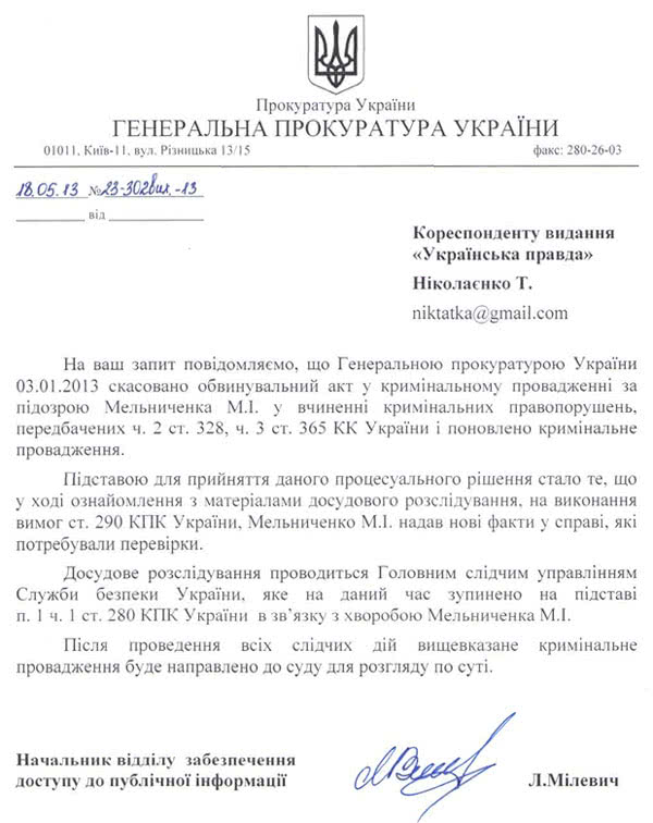 В СБУ на запит УП відповіли, що "Генеральною прокуратурою 3 січня скасовано обвинувальний акт у кримінальному провадженні за підозрою Мельниченка М. І. у вчиненні кримінальних правопорушень, передбачених ч.2 ст. 328, ч.3 ст. 365 КК України і поновлене кримінальне провадження".