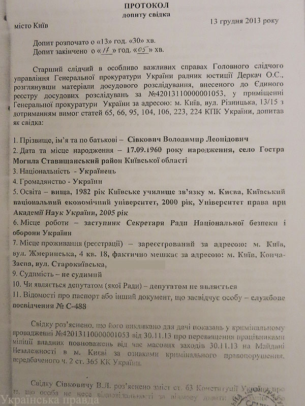 У розпорядженні Української правди з'явилися нові документи в справі про розслідування кривавого розгону ЄвроМайдану 30 листопада. Це - протоколи допиту першого секретаря Радбезу Володимира Сівковича та голови Київської міської державної адміністрації Олександра Попова.
