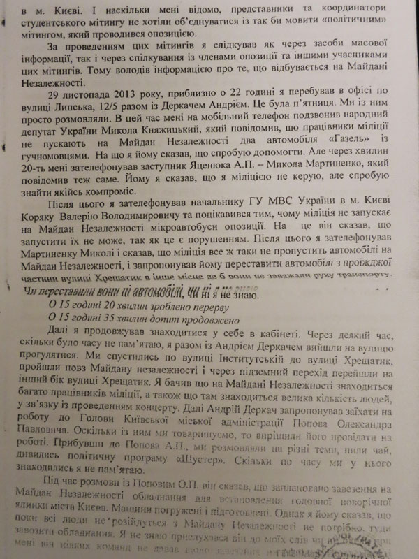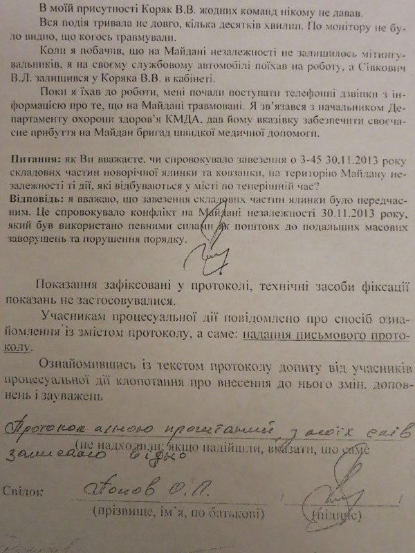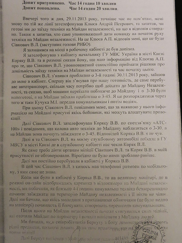 У минулій публікації ми оприлюднили протокол допиту керівника головного управління МВС в Києві Валерія Коряка та протокол очної ставки цих трьох осіб.