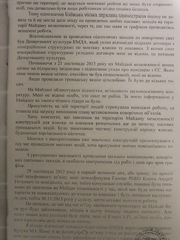 Однак свідчення Сівковича суперечать словам Попова на допиті. Той повідомив, що ще зранку 29 листопада - за добу до розгону - йому зателефонував секретар Радбезу Андрій Клюєв та почав вимагати поставити ялинку вже 30 листопада, а для придушення протестуючих міліція надасть "допомогу".