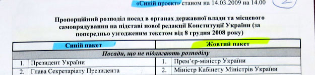 "Синій проект" означає, що він підготовлений Януковичем, який воліє собі забрати силовий блок, а Тимошенко віддати економічний. Але при цьому Янукович хоча залишити за собою посаду голови Нацбанку, а Тимошенко віддати маловпливову посаду голови наглядової ради НБУ.