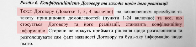 "Текст договору за виключенням преамбули та тексту принципових домовленосте та все, що стосується Договору та його реалізації, становить конфіденційну інформацію. Сторони не можуть розголошувати сам факт наявності Договору та будь-яку інформацію щодо нього".