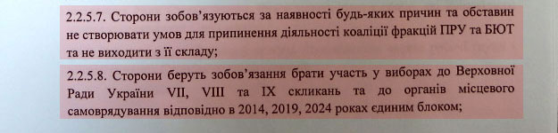 Сторони беруть зобов'язання брати участь у виборах до Верховної Ради 7, 8 та 9 скликань та до органів місцевого самоврядування відповідно в 2014, 2019 та 2024 роках єдиним блоком".