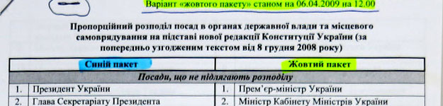 А ось варіант на переговори, які відбулися 6 квітня 2009 року. Його підготовлено стороною Тимошенко - він називається "жовтий проект".