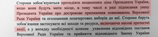"Сторони беруть зобов'язання застосувати всі заходи та ресурси, включаючи масові протестні акції, а у випадку необхідності (...) застосують відсторонення президента та розпочнуть процедуру імпічменту".