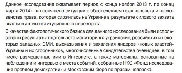 "В качестве фактологического базиса для данного исследования были использованы результаты тщательного мониторинга украинских, российских и некоторых западных СМИ, высказывания и заявления лидеров "новых властей" Украины и их сторонников, многочисленные свидетельства очевидцев, в том числе, размещенные в Интернете, а также материалы, основанные на наблюдении и интервью с места событий, собранные НКО "Фонд исследования проблем демократии" и Московским бюро по правам человека".