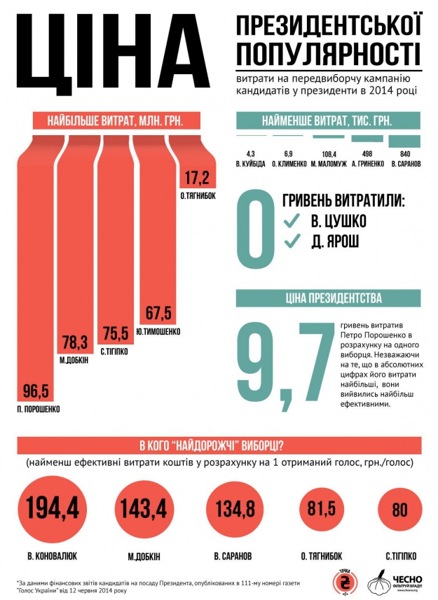 Найбільш активні інвестори у своє президентське майбутнє – Петро Порошенко – 96,5 мільйонів гривень, Михайло Добкін – 78,3 мільйона, та Сергій Тігіпко – 75,5 мільйонів.