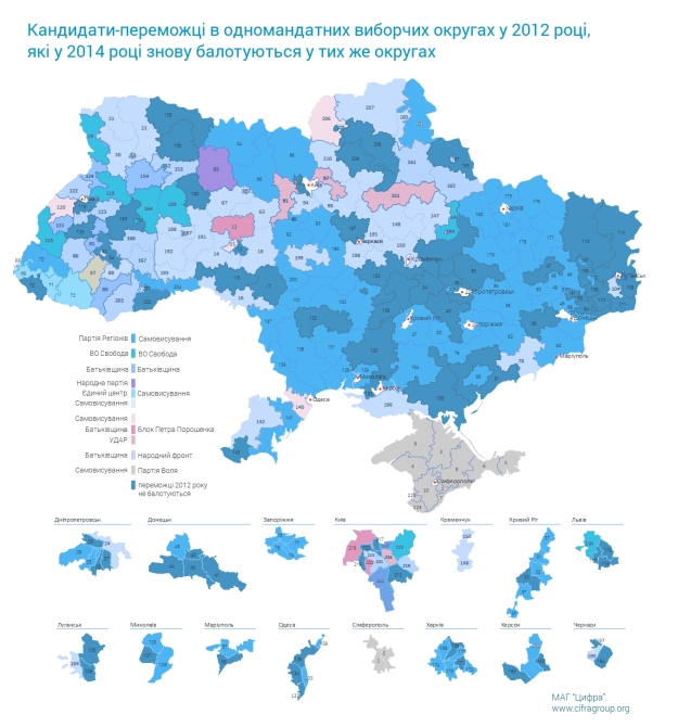 Абсолютна більшість чинних депутатів, що балотуються по мажоритарці – переможці виборів 2012 року в цих же округах. У 2/3 одномандатних виборчих округів виборцям буде запропоновано знову проголосувати за тих, кого вони підтримали на виборах два роки тому.