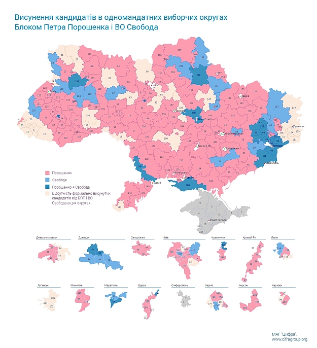 Також вартою уваги є та обставина, що БПП і ВО "Свобода" проігнорували висунення кандидатів у ряді виборчих округів Донецької і Луганської областей. Із 32 округів у цих областях БПП висунув кандидатів у 16 (Донецька область – 13, Луганська - 4), а ВО "Свобода" – у 21 (Донецька – 20, Луганська – 1).