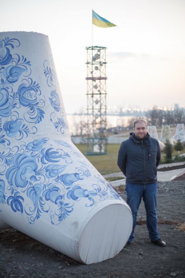 | Константин Батозский на фоне тетрапода. Сто тетраподов были изготовлены для укрепления береговой линии в Крыму, но заказчик от них отказался, а мариупольцы использовали для обороны города. Теперь - это один из символов столицы Приазовья. |
