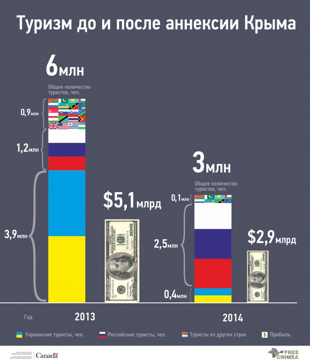 К первым относятся потери от падения туристического потока. Несмотря на браваду с обещаниями наполнить Крым туристами из России, прошлогодний туристический сезон оказался провальным. Ведь около 70% туристического потока на полуостров до аннексии составляли граждане Украины. Если раньше Крым получал 5,1 миллиардов долларов в год, то после аннексии его туристическая прибыль составляет только 2,9 миллиарда.