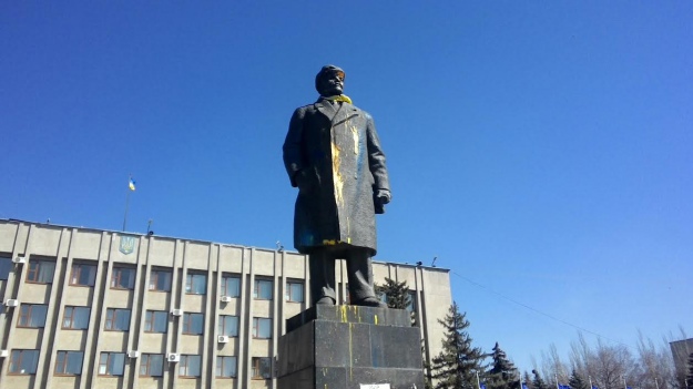 На все еще уверенно стоящем здесь памятнике Ленину с недавних пор красуется выкрашенный желто-голубой краской пионерский галстук и такого же цвета потеки.