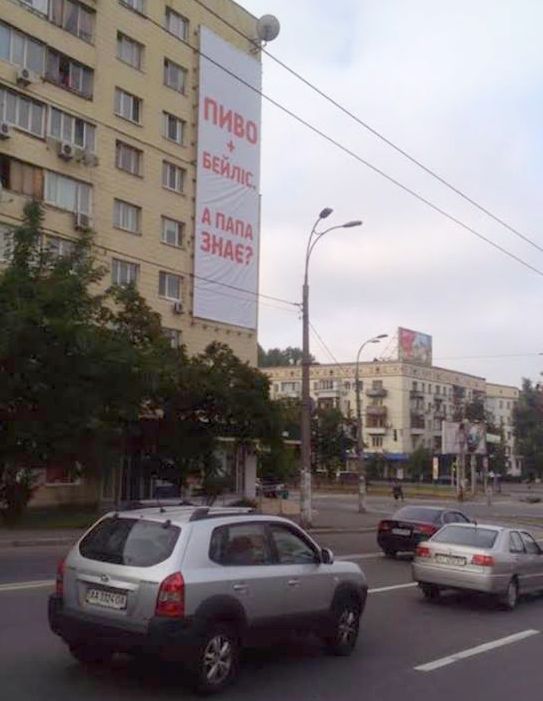 На прошлой неделе возле Минтранса вывесили плакат "Пиво+ Бейлис. А папа знает" с намеком на фамилии министра инфраструктуры Андрея Пивоварского и внештатного советника президента Порошенко Михаила Бейлина.