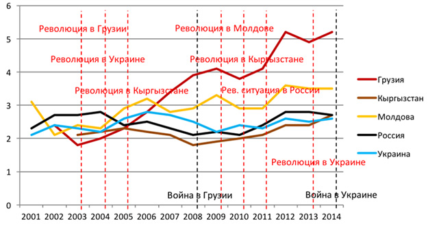 Войн и революций на постсоветском пространстве было предостаточно, даже если рассматривать события лишь последних 15 лет. Украина и Кыргызстан пережили по две революции, Грузия и Молдова – по одной, Россия – одну революционную ситуацию. Грузия и Украина были участниками войн, причем второй стороной в обоих случаях была одна и та же страна – Россия.