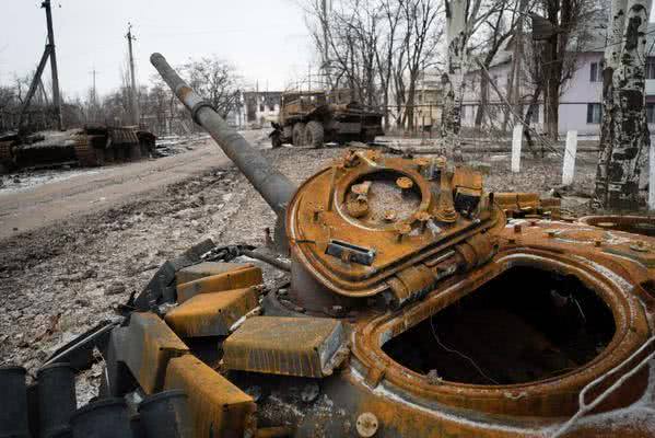 | Центр міста Вуглегірськ. Удалині підбитий танк 30 ОМБр, Поблизу знищений танк російської армії |
